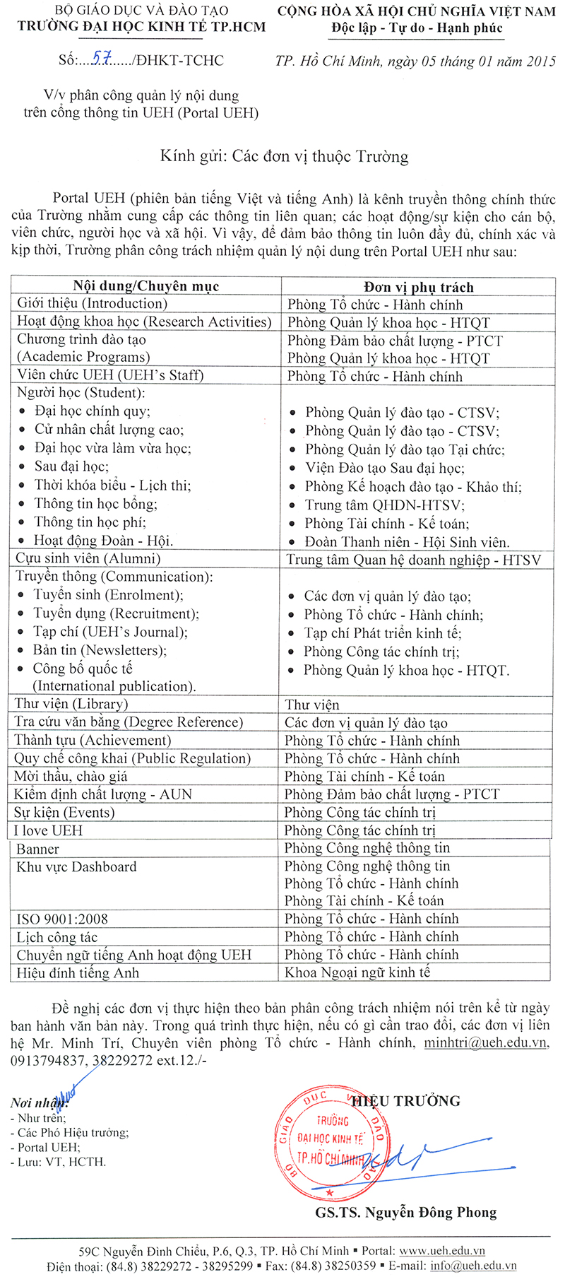 Công văn về việc phân công quản lý nội dung trên cổng thông tin UEH (UEH Portal)