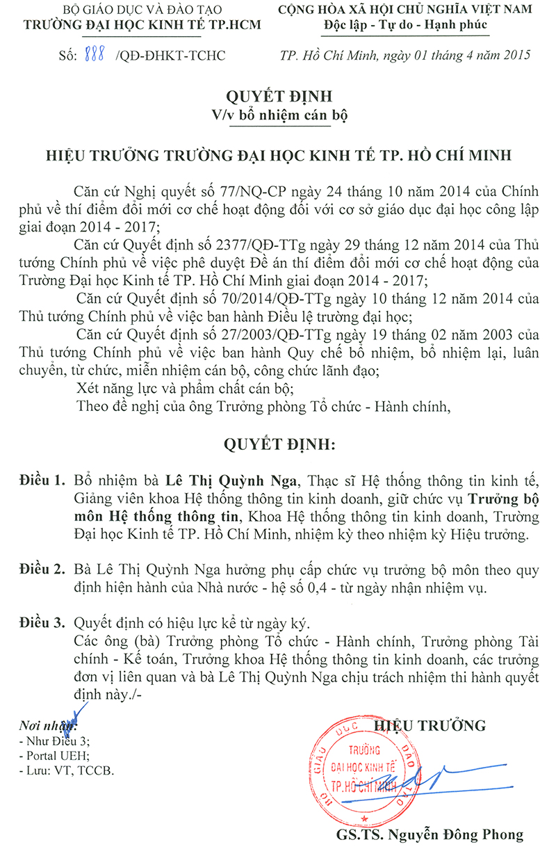 Quyết định về việc bổ nhiệm Thạc sĩ Lê Thị Quỳnh Nga giữ chức vụ Trưởng bộ môn Hệ thống thông tin, Khoa Hệ thống thông tin kinh doanh