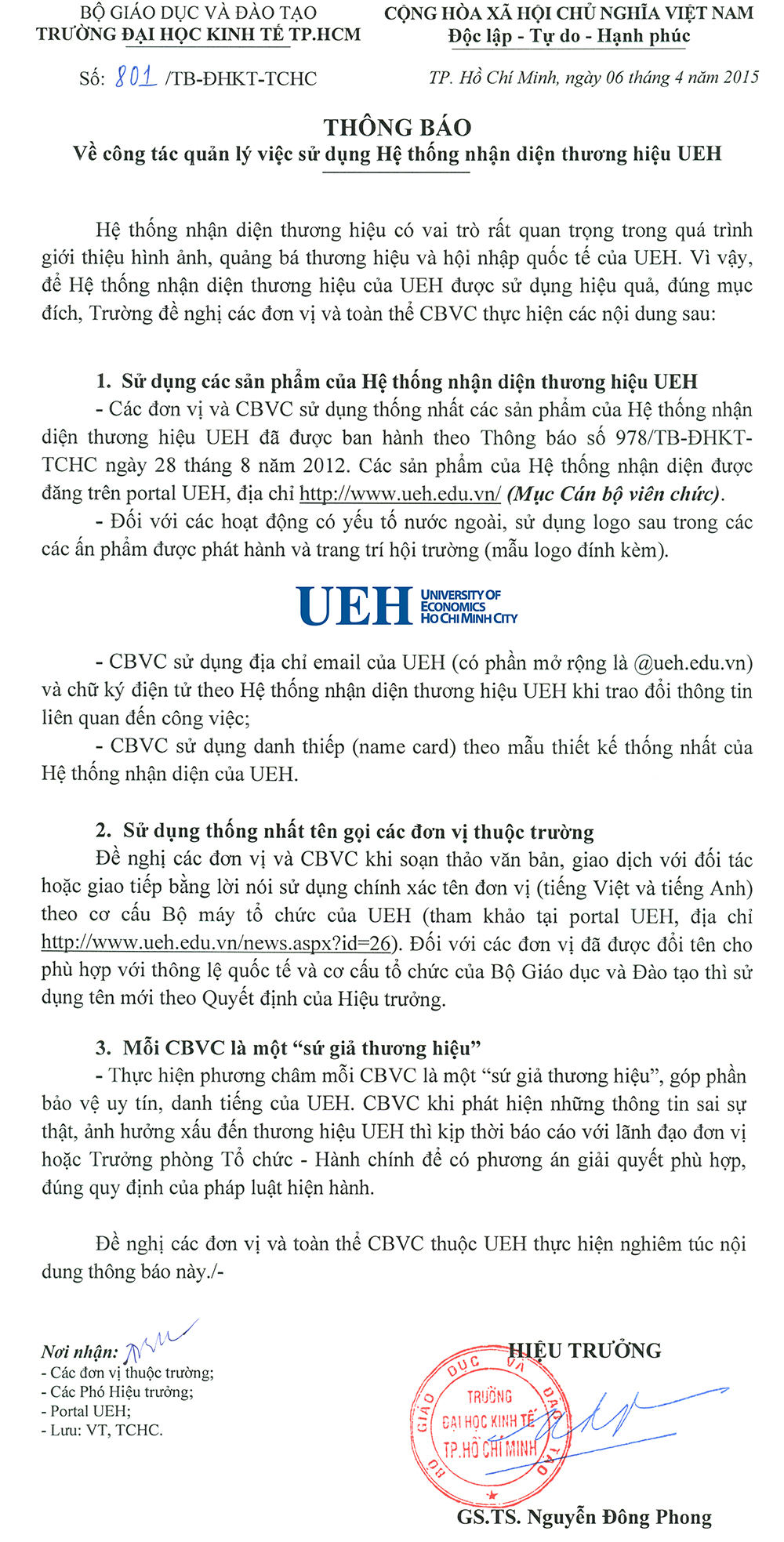 Thông báo về công tác quản lý việc sử dụng Hệ thống nhận diện thương hiệu UEH