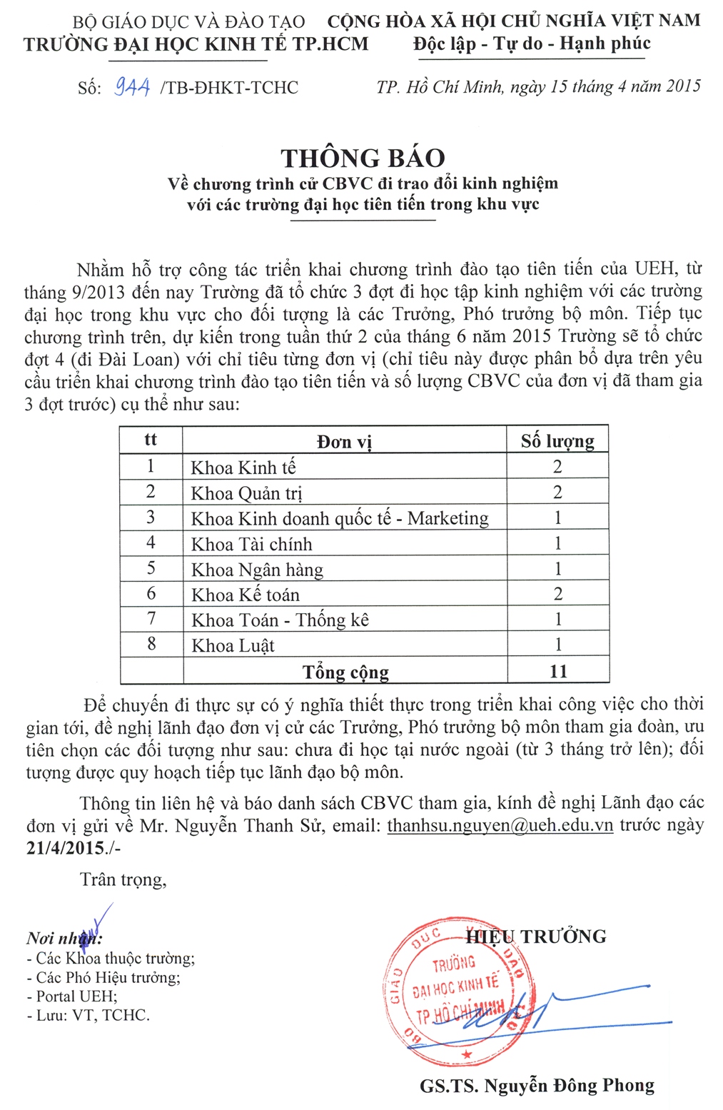 Thông báo về chương trình cử CBVC đi trao đổi kinh nghiệm với các trường đại học tiên tiến trong khu vực