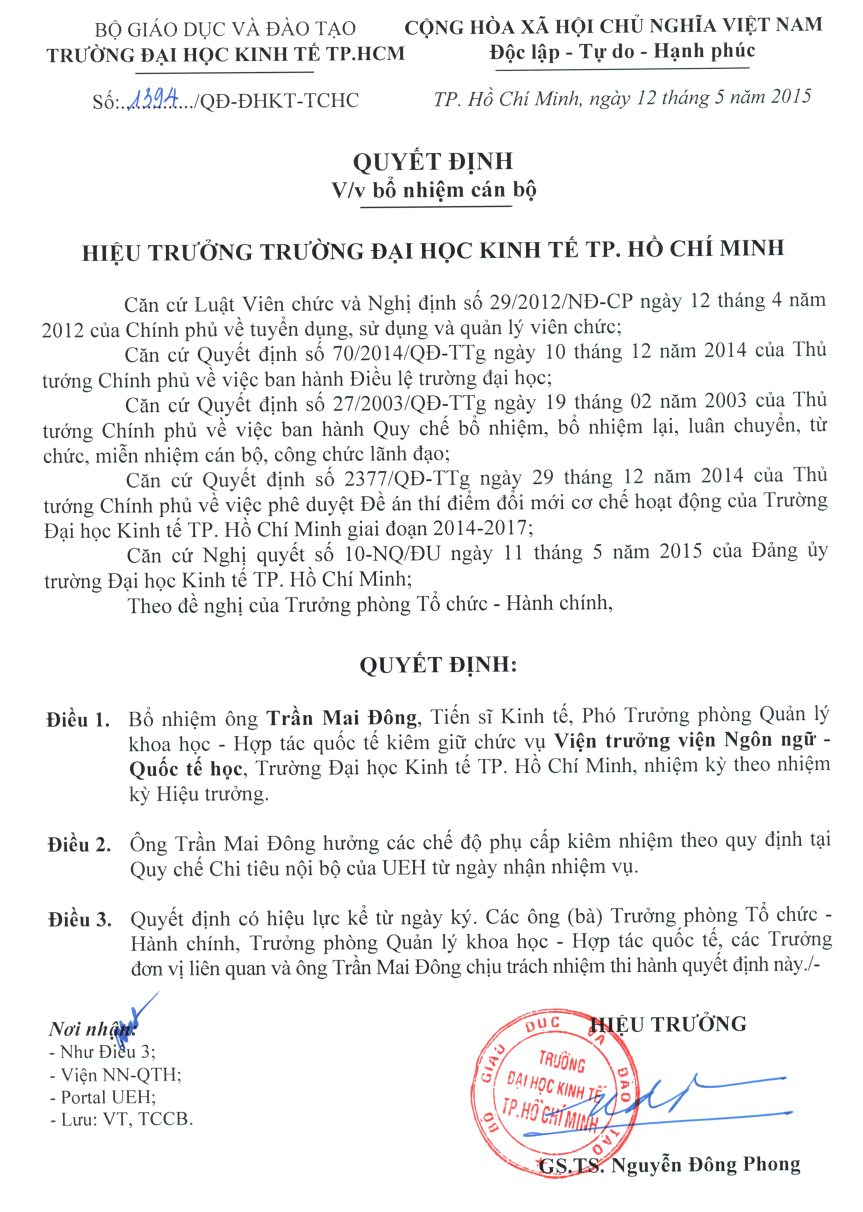 Quyết định bổ nhiệm TS. Trần Mai Đông kiêm giữ chức vụ Viện trưởng viện Ngôn ngữ – Quốc tế học