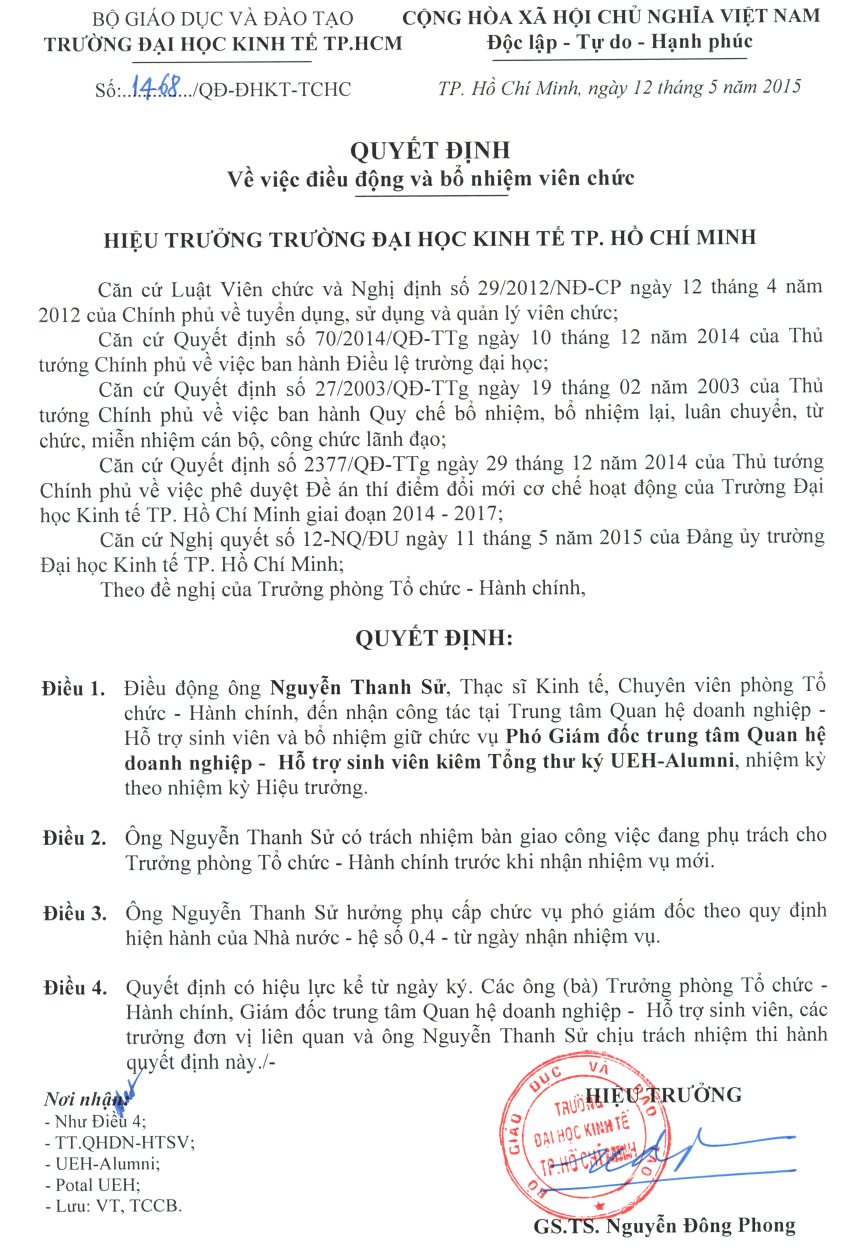 Quyết định điều động và bổ nhiệm Thạc sĩ Nguyễn Thanh Sử, Chuyên viên phòng Tổ chức – Hành chính