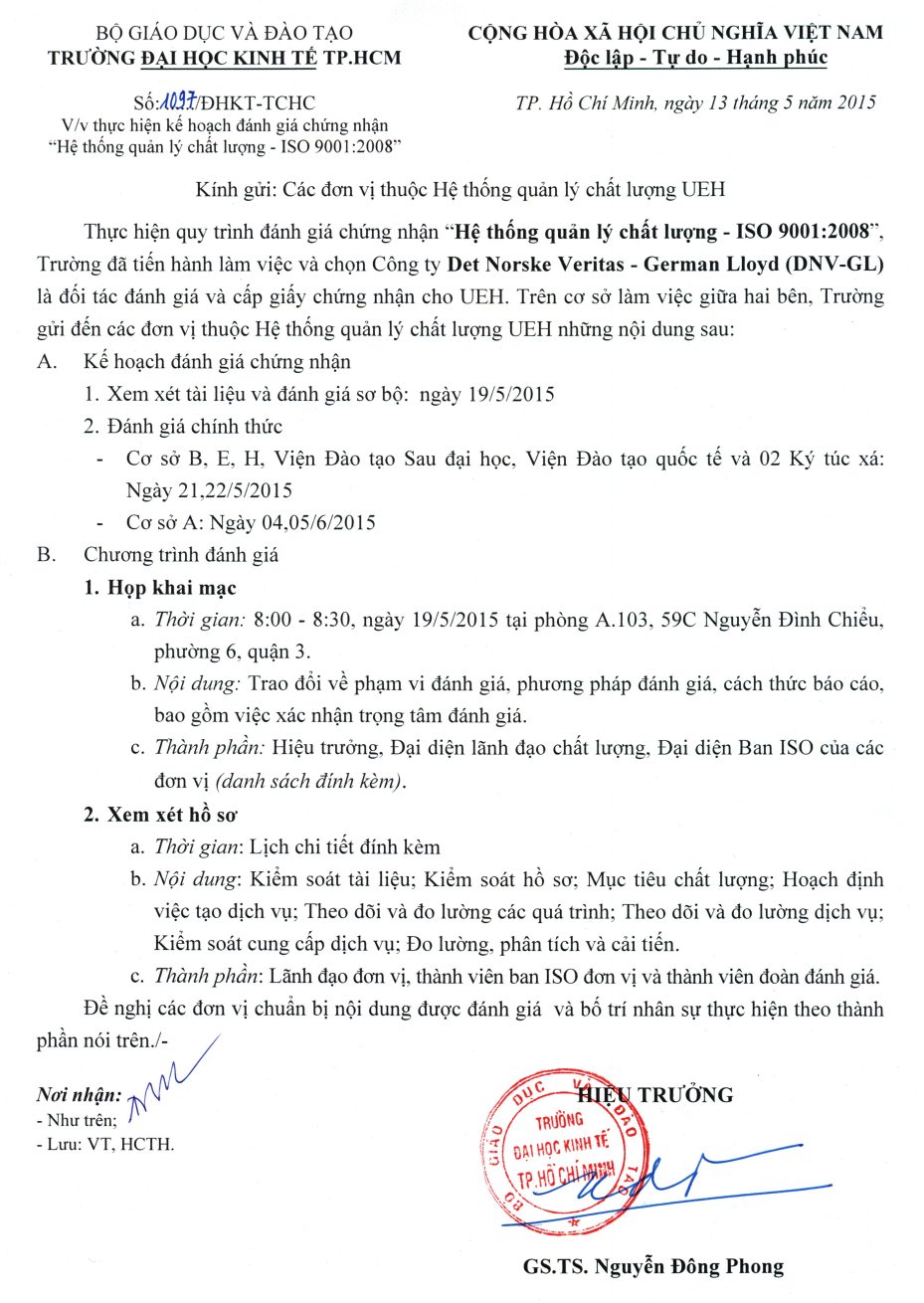 Công văn về việc thực hiện đánh giá chứng nhận “Hệ thống quản lý chất lượng – ISO 9001:2008”