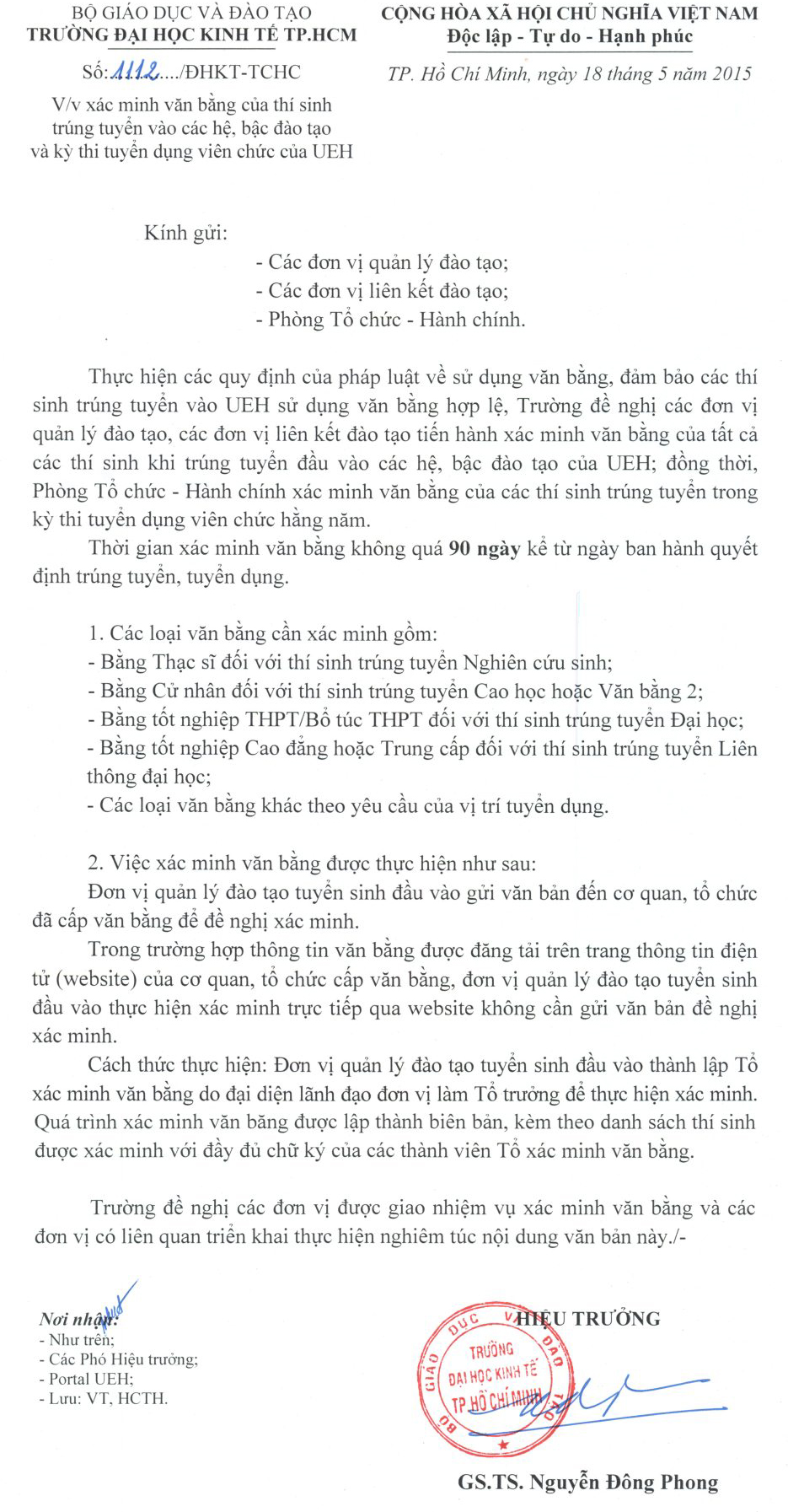 Công văn về việc xác minh văn bằng của thí sinh trúng tuyển vào các hệ, bậc đào tạo và kỳ thi tuyển dụng của UEH