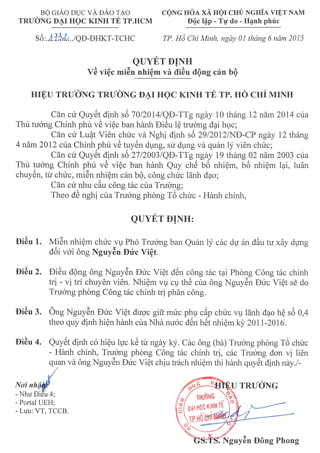 Quyết định về việc miễn nhiệm và điều động ông Nguyễn Đức Việt, Phó Trưởng ban Quản lý các dự án đầu tư xây dựng