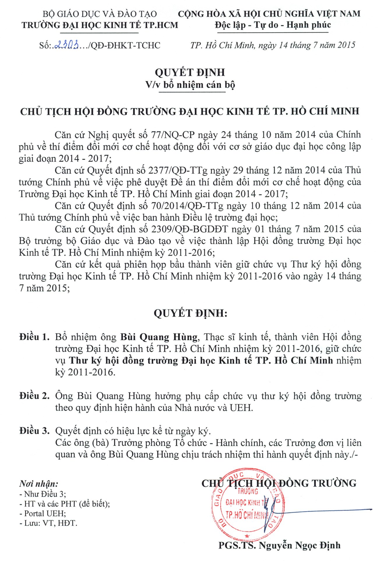 Quyết định về việc bổ nhiệm ThS. Bùi Quang Hùng giữ chức vụ Thư ký hội đồng trường Trường Đại học Kinh tế TP. Hồ Chí Minh nhiệm kỳ 2011 – 2016