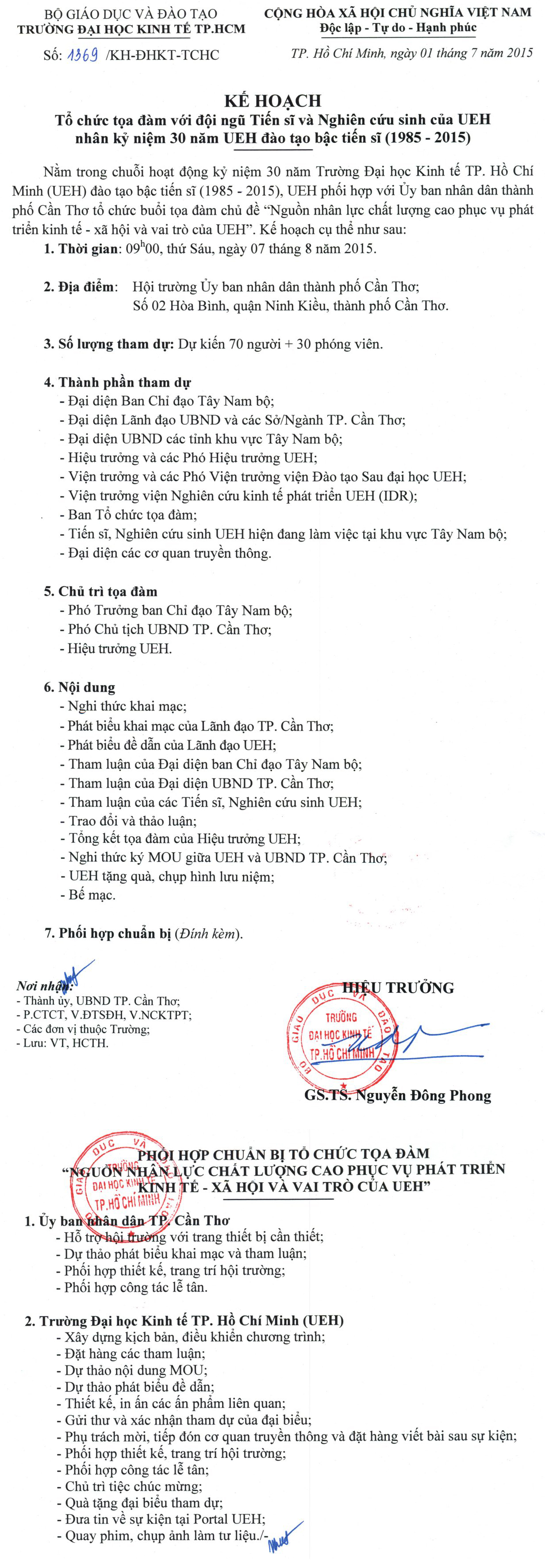 Kế hoạch tổ chức tọa đàm với đội ngũ Tiến sĩ và Nghiên cứu sinh của UEH nhân kỷ niệm 30 năm UEH đào tạo bậc tiến sĩ (1985 – 2015)