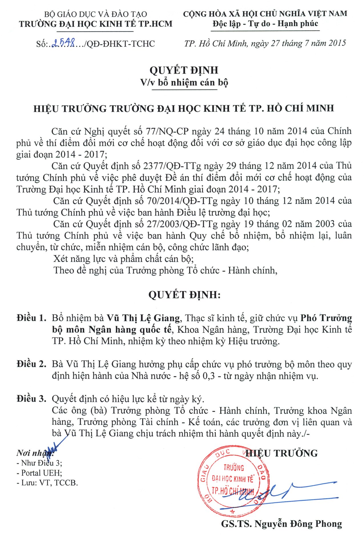 Quyết định về việc bổ nhiệm Th.S Vũ Thị Lệ Giang giữ chức vụ Phó Trưởng bộ môn Ngân hàng quốc tế, khoa Ngân hàng