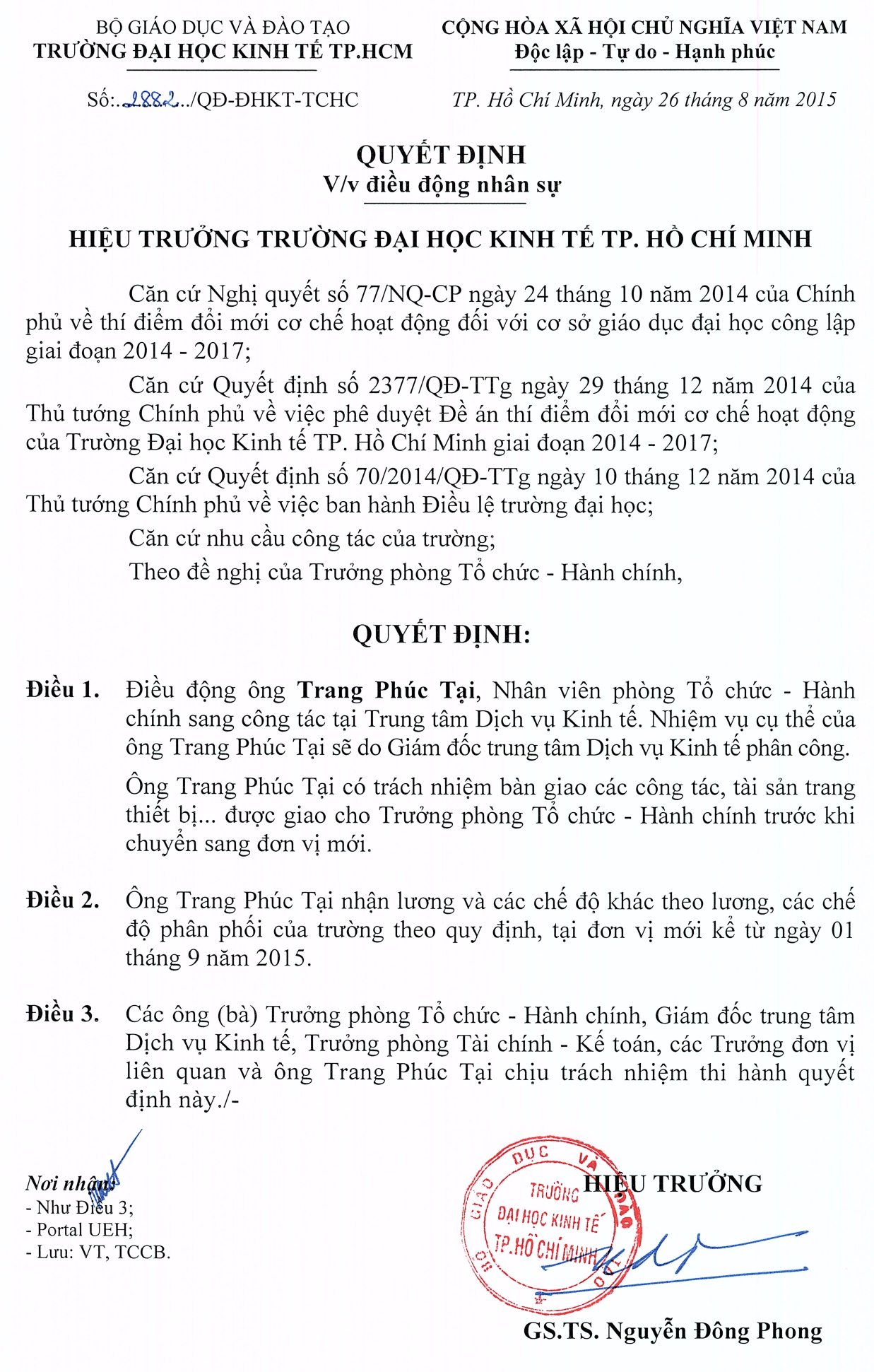 Quyết định về việc điều động ông Trang Phúc Tại, Nhân viên phòng Tổ chức – Hành chính