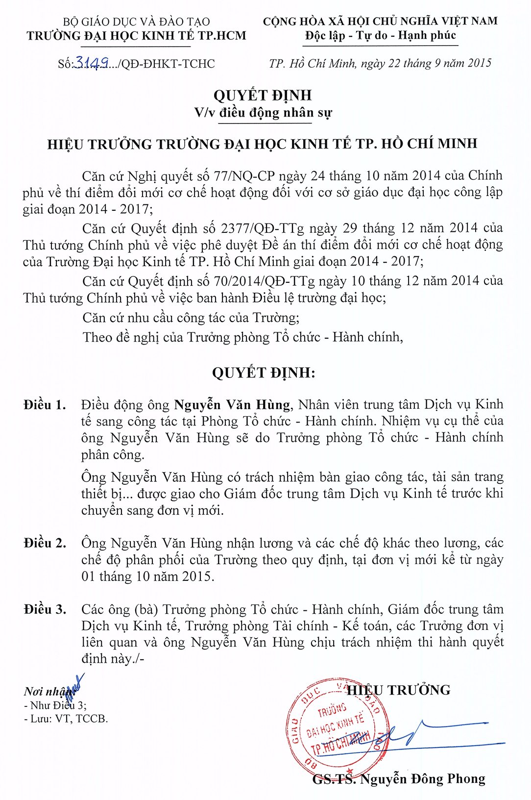 Quyết định về việc điều động ông Nguyễn Văn Hùng, Nhân viên trung tâm Dịch vụ Kinh tế