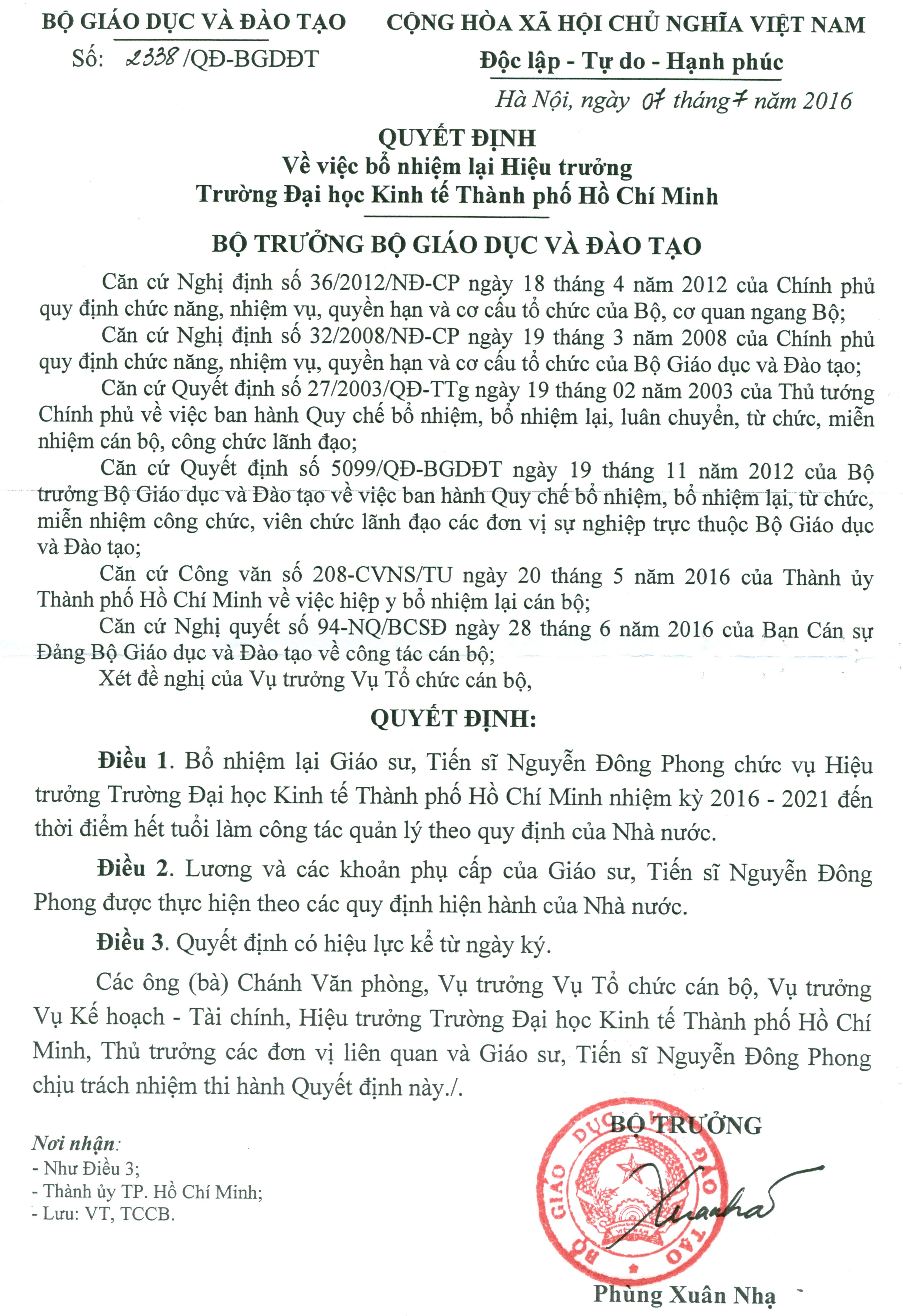 Quyết định về việc bổ nhiệm lại GS.TS. Nguyễn Đông Phong chức vụ Hiệu trưởng trường Đại học Kinh tế TP. Hồ Chí Minh, nhiệm kỳ 2016-2021