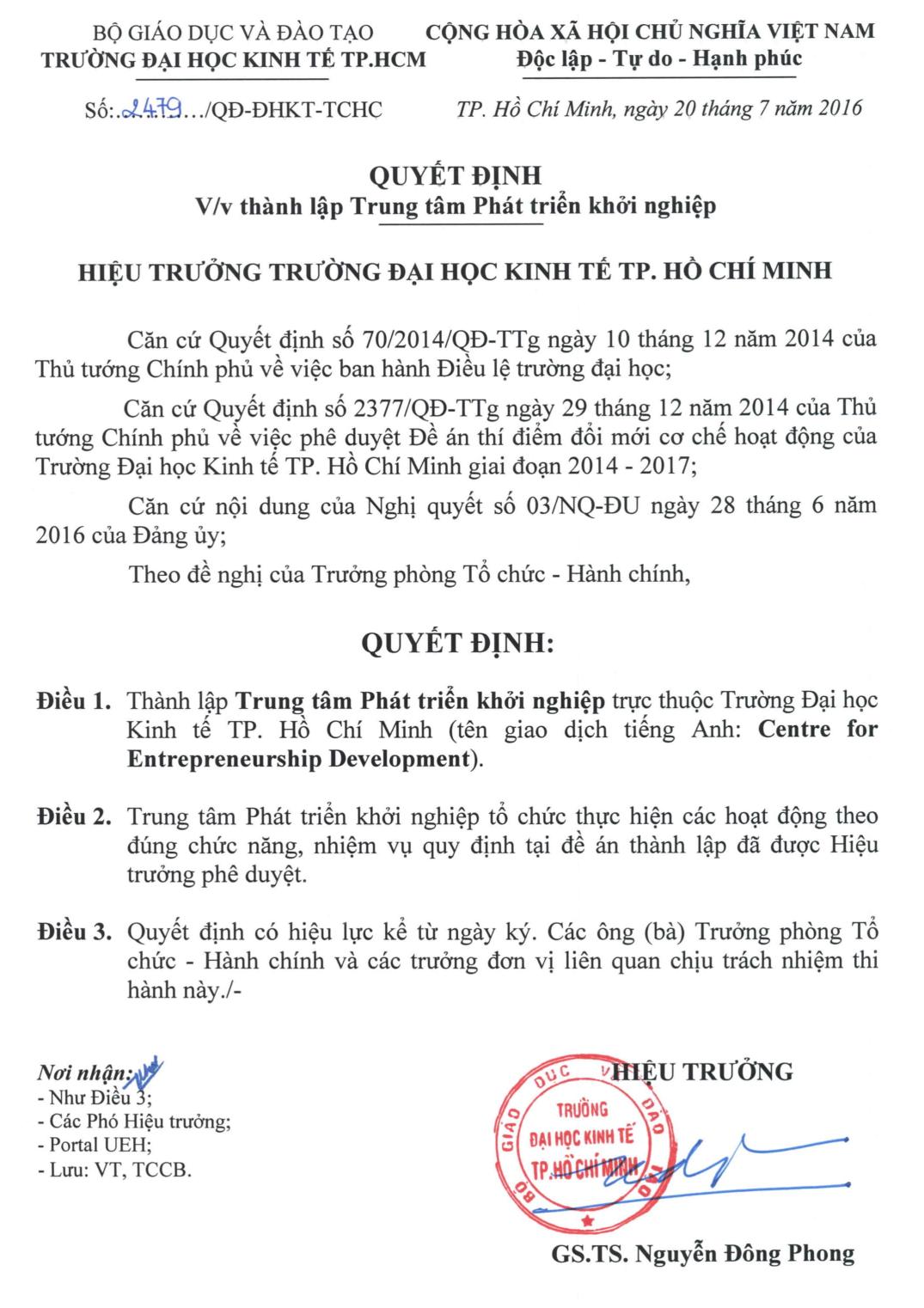Quyết định về việc thành lập Trung tâm Phát triển khởi nghiệp