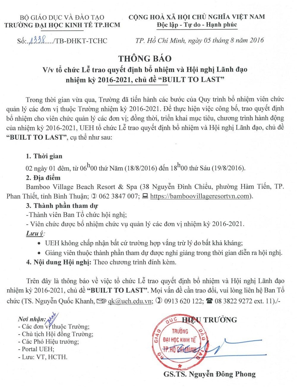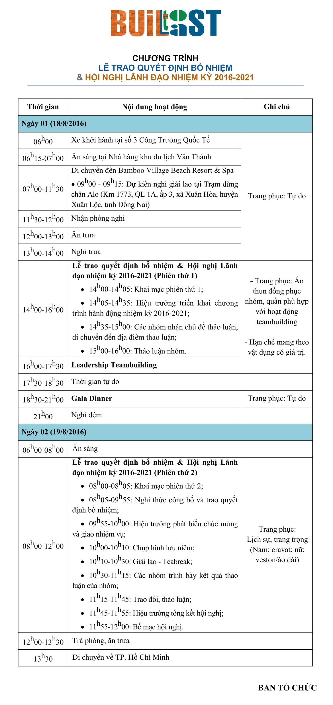 Thông báo về việc tổ chức Lễ trao quyết định bổ nhiệm và Hội nghị Lãnh đạo nhiệm kỳ 2016-2021, chủ đề “BUILT TO LAST”