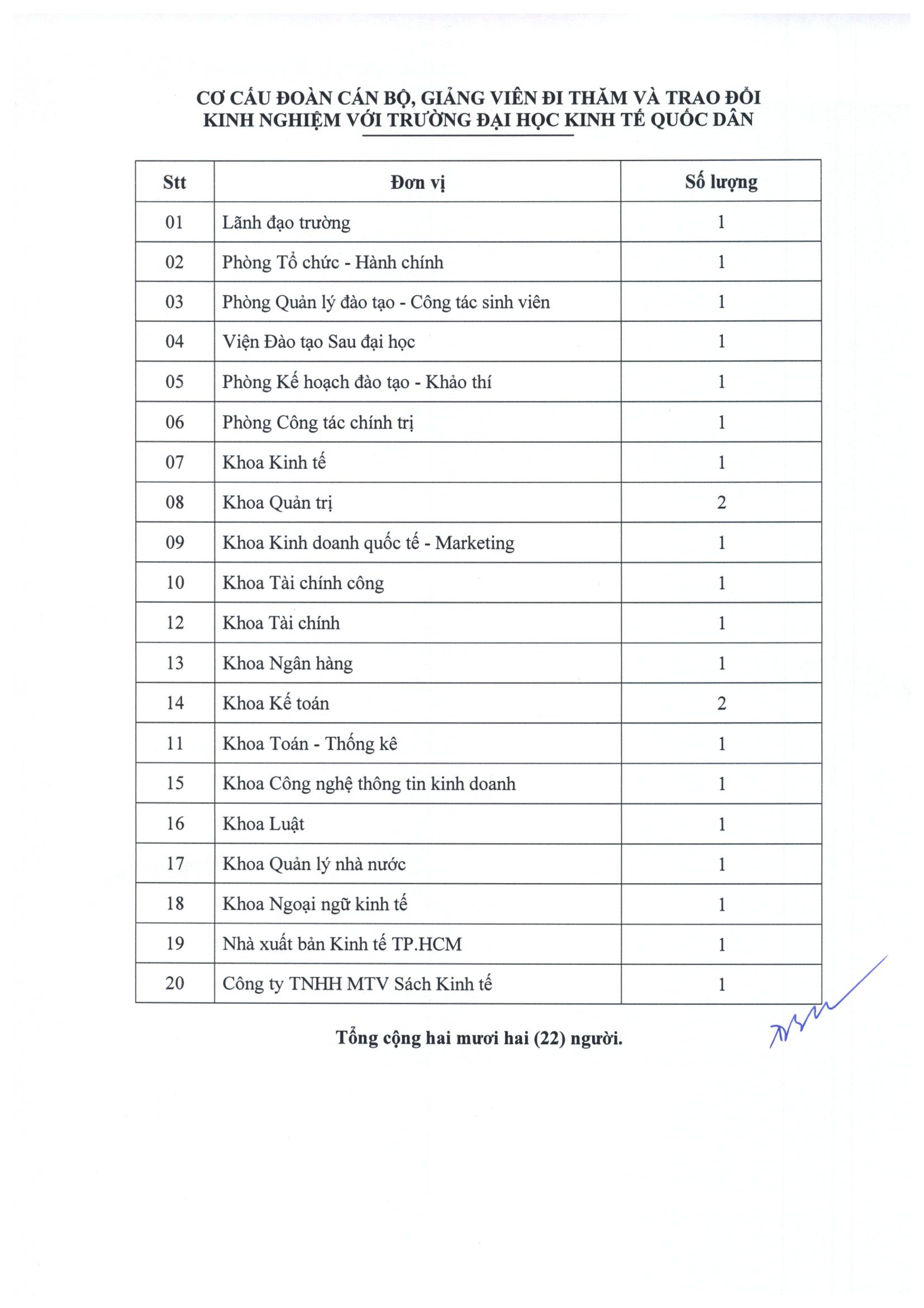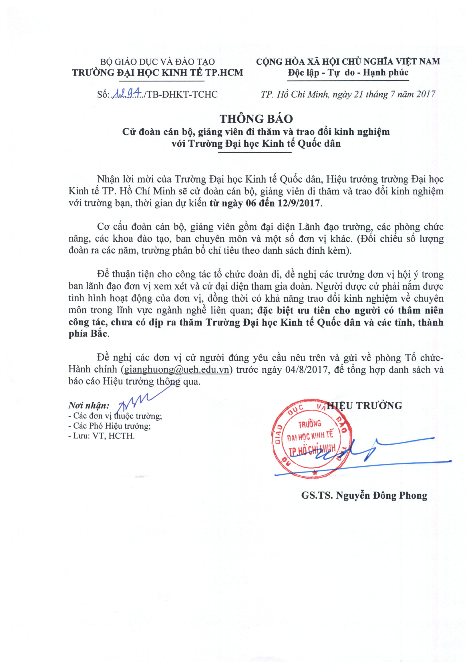 Thông báo cử đoàn cán bộ, giảng viên đi thăm và trao đổi kinh nghiệm với Trường Đại học Kinh tế Quốc dân