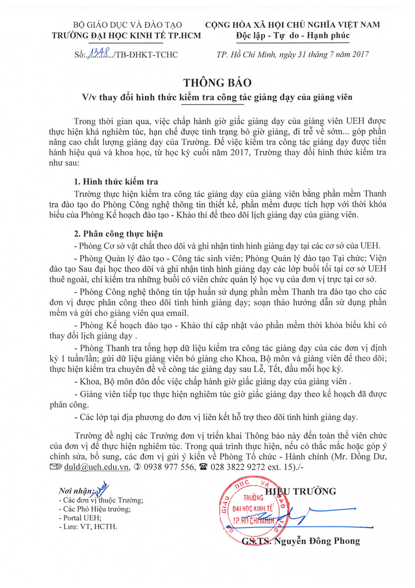 Thông báo về việc thay đổi hình thức kiểm tra công tác giảng dạy của giảng viên